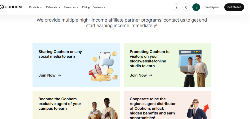 If you have a public platform (blog, channel, or community) and want to monetize referrals, the Coohom Affiliate Program offers decent earning potential with its ~30% commission structure, low payout threshold, and global usability. The infrastructure seems solid with daily reporting, promotional assets, and flexible payout options.